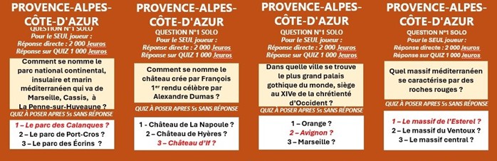 Chaque reçoit du plus jeune joueur un des 8 paquets. Chacun contient 13 cartes dans le même ordre alphabétique, une par région avec sur chacune 2 questions « solo ».